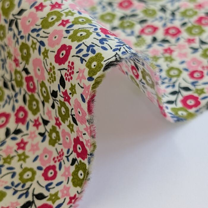 ・輸入リバティプリントは、ミミ端に色抜けやズレがあるため、当店では有効生地幅を約130cmとご案内しております。