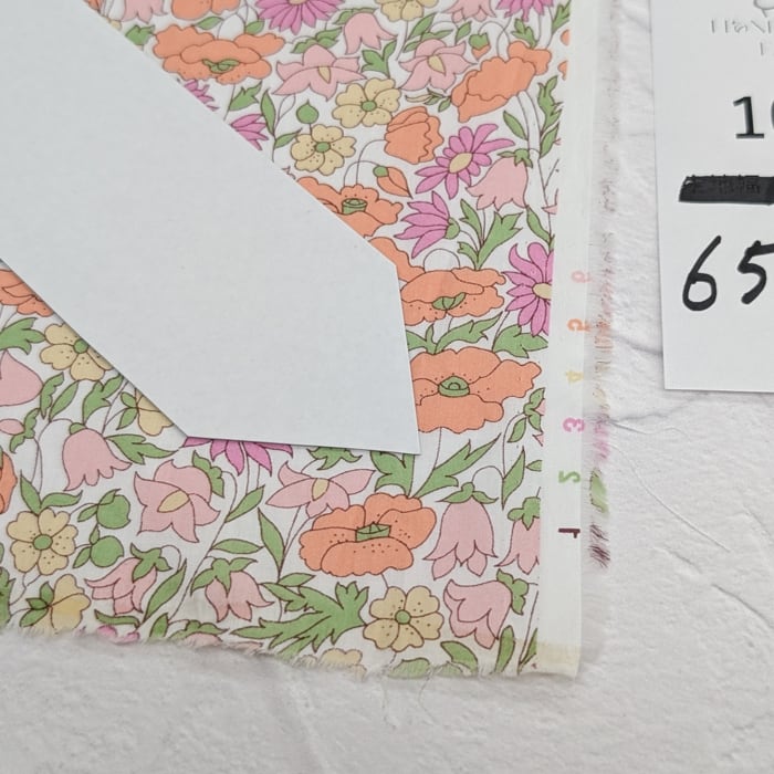 カットクロスの横にあるカードに、生地のサイズを記載しています。