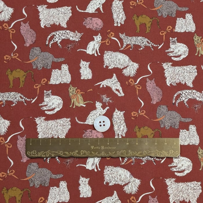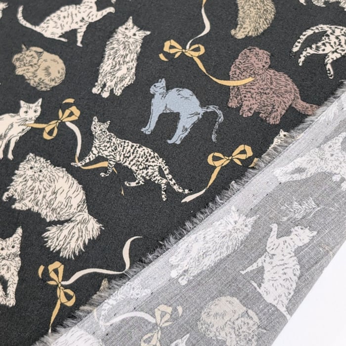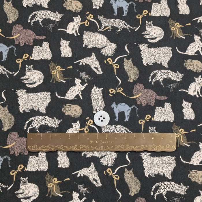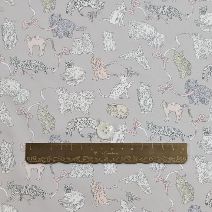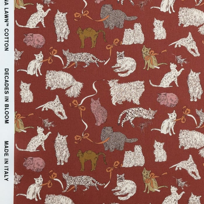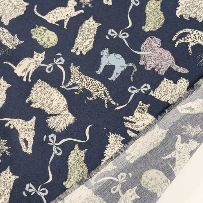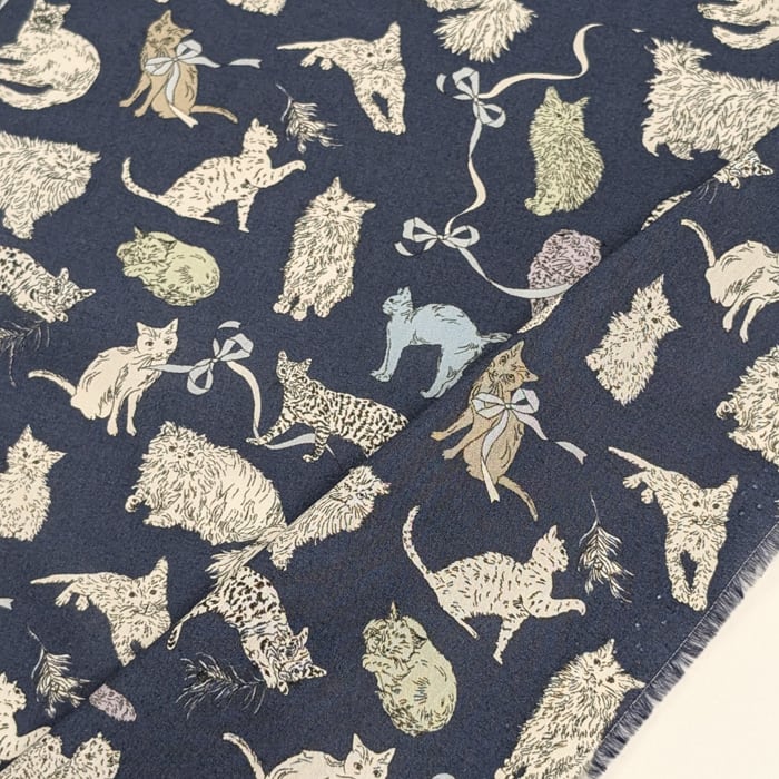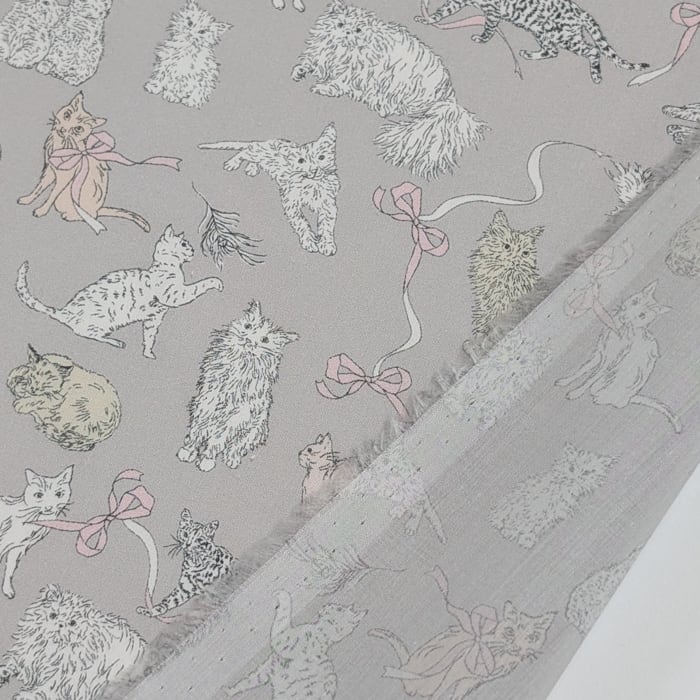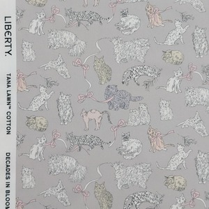 愛らしいキャラクター豊かな猫たちが、遊んだりくつろいだり、思い思いに動き回る会話のようなパターンです。リバティの人気デザイン「ミャウ(Meow)」から着想を得たこの新たな作品は、日本と英国のリバティスタッフが実際に飼っている猫たちをモチーフにしています。鉛筆で描かれたイラストは、リボンや蝶結びの間を遊び回る猫たちの愛らしい仕草と、自由でユーモラスな個性を見事に捉えています。
