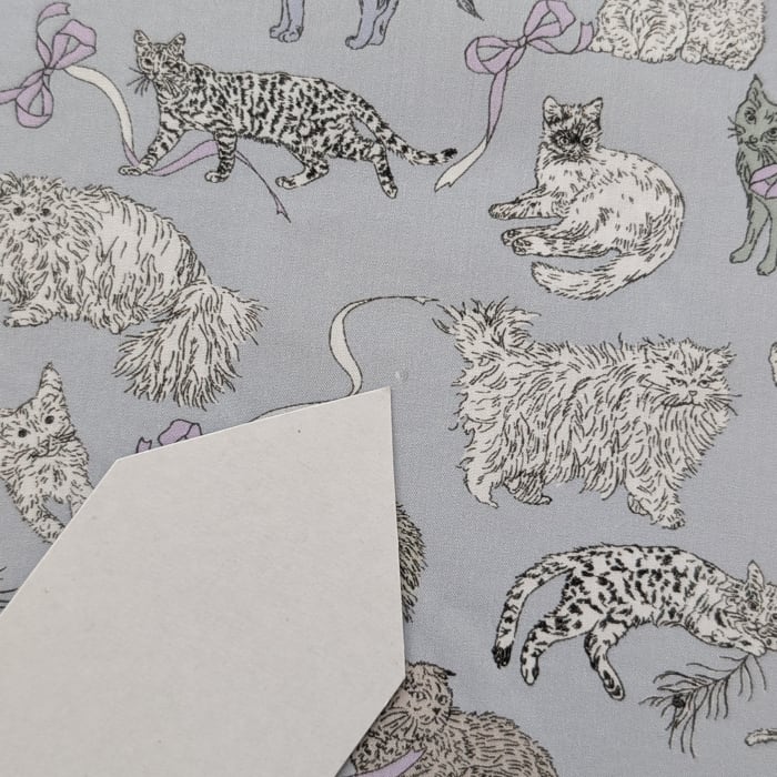 愛らしいキャラクター豊かな猫たちが、遊んだりくつろいだり、思い思いに動き回る会話のようなパターンです。リバティの人気デザイン「ミャウ(Meow)」から着想を得たこの新たな作品は、日本と英国のリバティスタッフが実際に飼っている猫たちをモチーフにしています。鉛筆で描かれたイラストは、リボンや蝶結びの間を遊び回る猫たちの愛らしい仕草と、自由でユーモラスな個性を見事に捉えています。