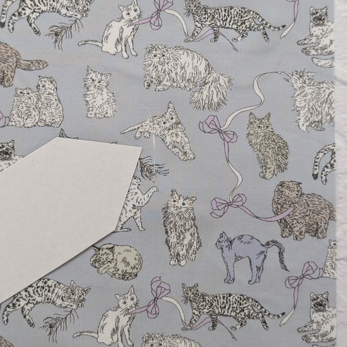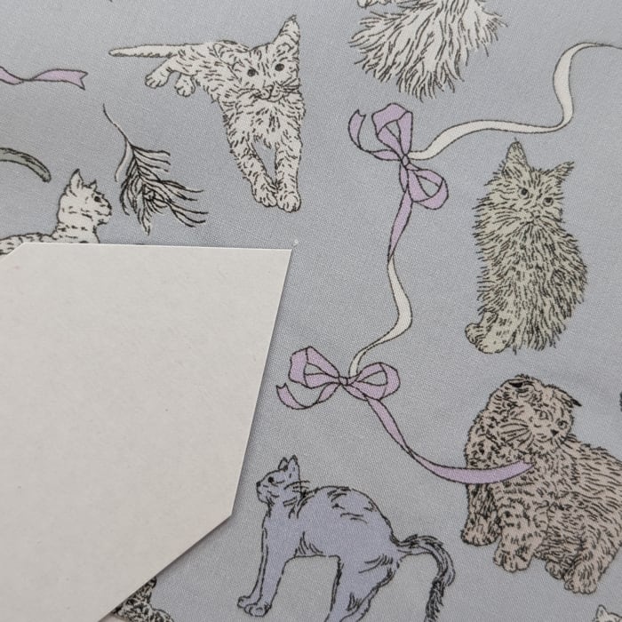 愛らしいキャラクター豊かな猫たちが、遊んだりくつろいだり、思い思いに動き回る会話のようなパターンです。リバティの人気デザイン「ミャウ(Meow)」から着想を得たこの新たな作品は、日本と英国のリバティスタッフが実際に飼っている猫たちをモチーフにしています。鉛筆で描かれたイラストは、リボンや蝶結びの間を遊び回る猫たちの愛らしい仕草と、自由でユーモラスな個性を見事に捉えています。