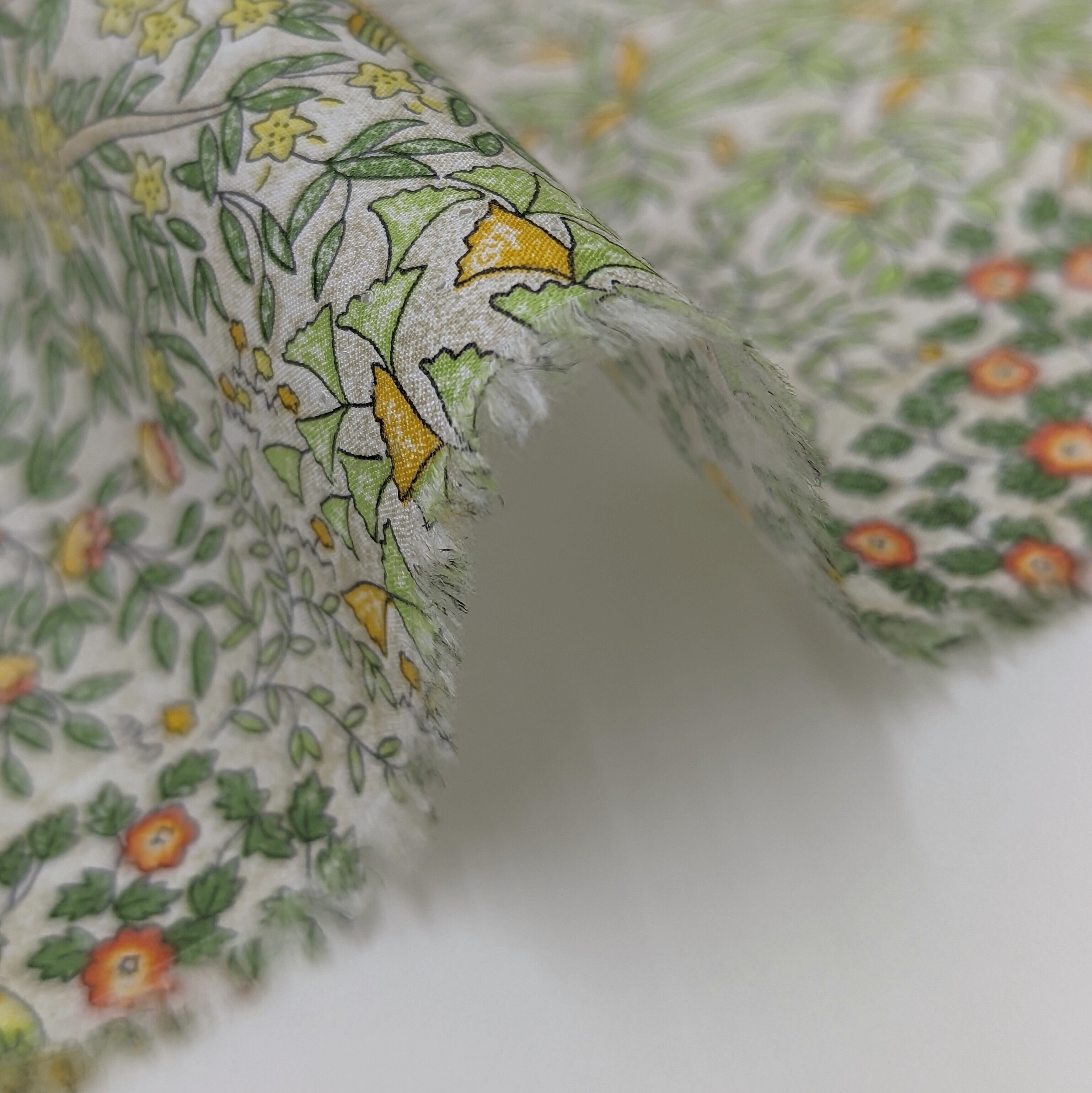 ・輸入リバティプリントは、ミミ端に色抜けやズレがあるため、当店では有効生地幅を約130cmとご案内しております。